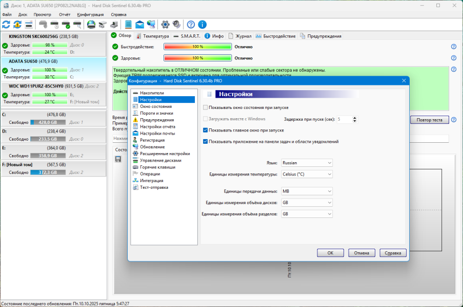 Фоновый анализ: Hard Disk Sentinel постоянно работает в фоне, анализируя состояние накопителей. При обнаружении ошибок или превышении заранее установленных порогов программа предупреждает пользователя. Основная роль здесь принадлежит S.M.A.R.T., позволяющей быстро и надежно отслеживать критически важные показатели дисков.