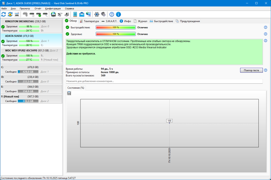 S.M.A.R.T. мониторинг: технология самодиагностики, встроенная в большинство современных накопителей, позволяет отслеживать ключевые параметры диска. Программа измеряет скорость передачи данных в реальном времени, что может быть использовано для тестирования производительности и выявления аномалий.