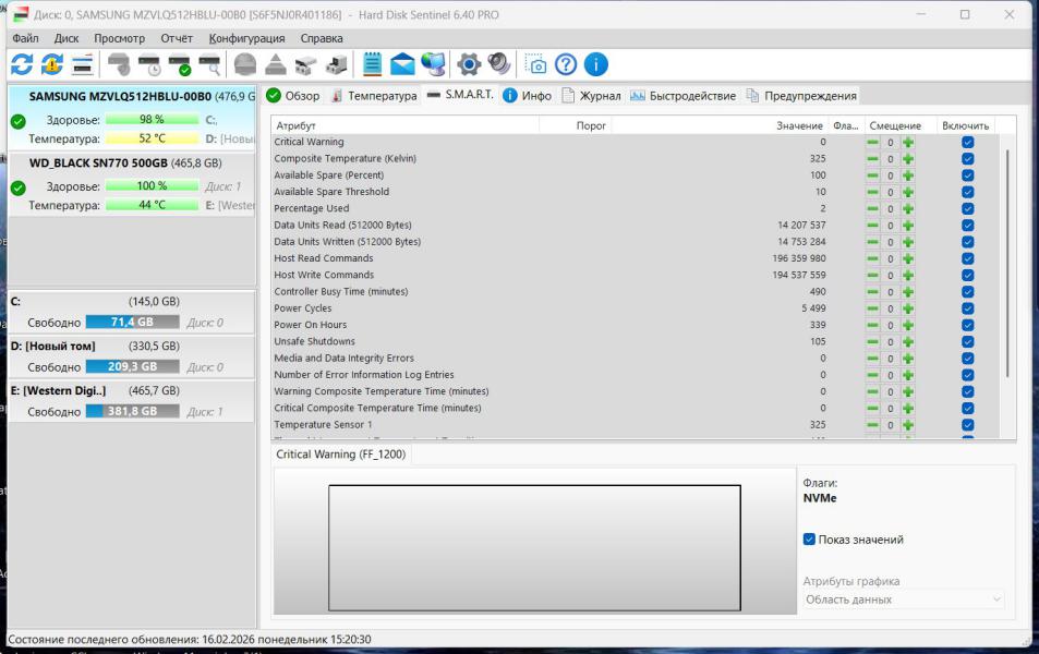 Выводятся подробные сведения по всем разделам в системе, независимо от количества установленных накопителей; в дальнейшем эти данные используются для автоматического предупреждения и наглядного отображения статуса.
