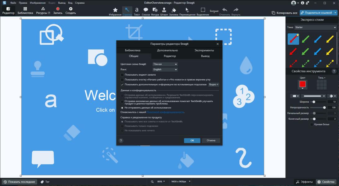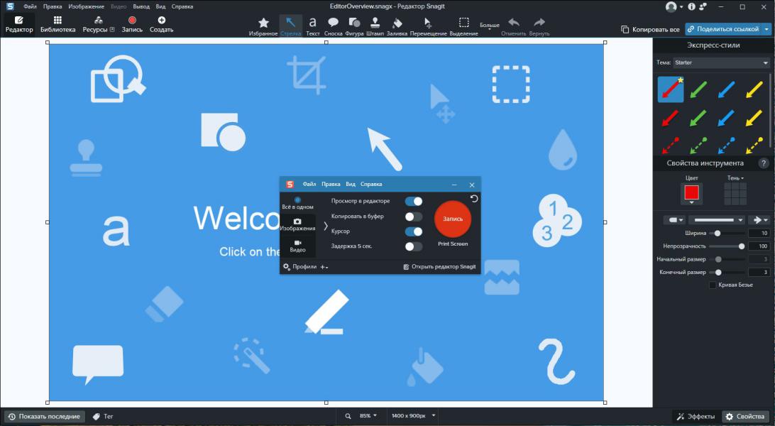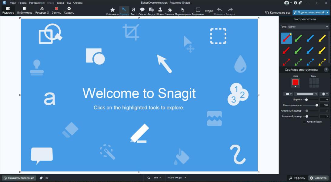Мощный встроенный растровый редактор Snagit Editor Редактор поддерживает наложение форматированного текста с гибкой настройкой цвета, шрифта, прозрачности и объёмных теней. Доступны операции вращения, обрезки и масштабирования изображений. В арсенале инструментов присутствуют кисти, штампы, распылители, карандаши, линии, стрелки, геометрические фигуры, пипетка для точного выбора цвета и фигурное выделение областей. Реализовано более пятидесяти уровней отмены действий, что позволяет безопасно экспериментировать. Готовые изображения можно сохранить в файл, скопировать в буфер обмена, отправить на печать или по электронной почте.