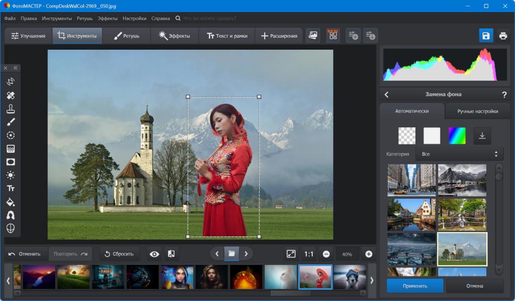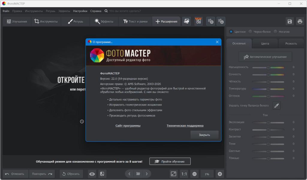 ФотоМАСТЕР — это современное и функциональное решение для детальной обработки и улучшения цифровых изображений. Программа разработана с упором на высокую скорость работы и максимальное сохранение качества. Благодаря продуманной архитектуре редактирования, пользователь может свободно изменять любые параметры фотографии и в любой момент отменять действия в произвольной последовательности без ухудшения итогового результата.