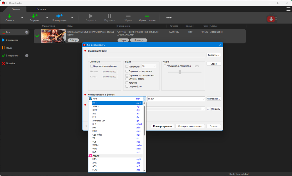 Конвертация видео и аудио YTDownloader оснащён встроенным конвертером, который поддерживает все популярные видео- и аудиоформаты. Можно конвертировать как загруженные файлы, так и локальные записи.
