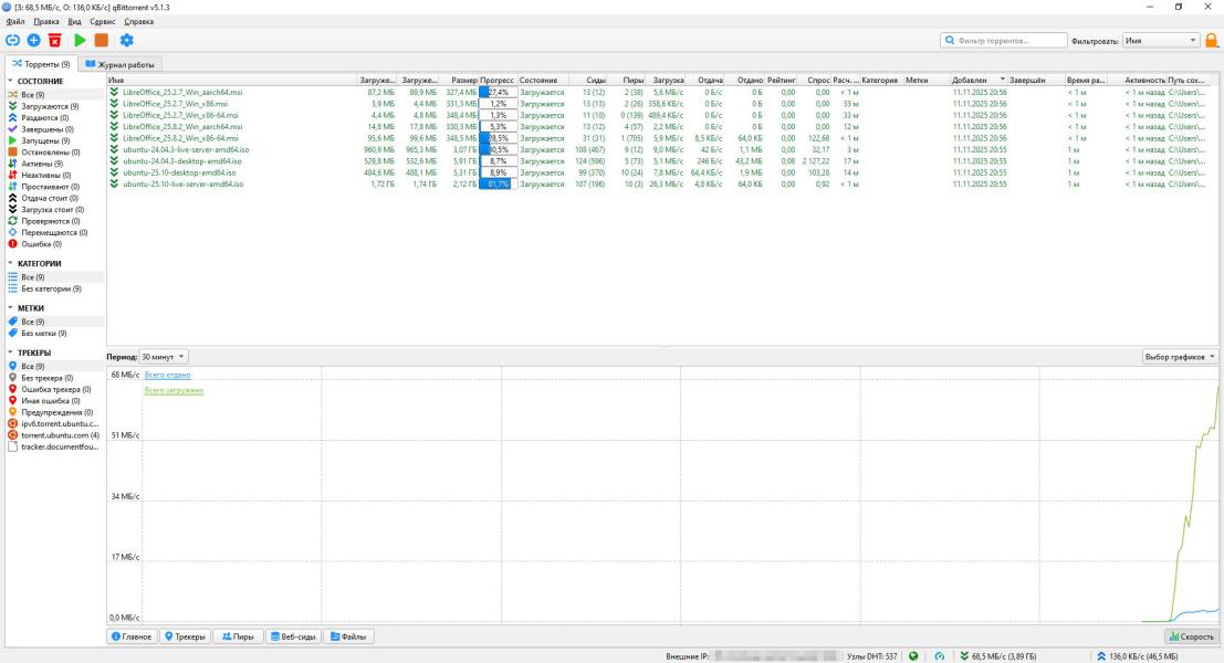 qBittorrent — это мощный, полностью бесплатный торрент-клиент без рекламы, сочетающий простоту интерфейса с широким функционалом. Несмотря на лёгкость в использовании, программа предоставляет внушительный набор профессиональных инструментов: встроенную систему поиска с возможностью расширения с помощью плагинов, поддержку UPnP/NAT-PMP, продвинутый менеджер ограничения скорости, IP-фильтрацию, удалённый доступ через веб-интерфейс и опцию последовательной загрузки файлов.