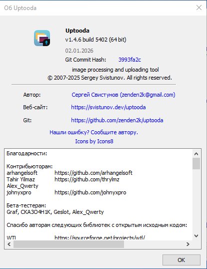 Uptooda (ранее известная как Image Uploader) — это бесплатное приложение с открытым исходным кодом для операционных систем Windows, предназначенное для удобной загрузки изображений, фотографий и отдельных кадров из видео в сеть Интернет. Для размещения файлов программа использует несколько десятков общедоступных файловых и графических хостингов. В процессе загрузки Uptooda автоматически создаёт миниатюры заданного размера, выполняет масштабирование изображений, а при необходимости может добавить пользовательский текст или логотип. Поддерживаются форматы JPG, GIF, PNG, BMP и TIFF. По завершении загрузки пользователь получает готовый список ссылок, а также коды HTML и BBCode, подходящие для форумов, блогов и других площадок.