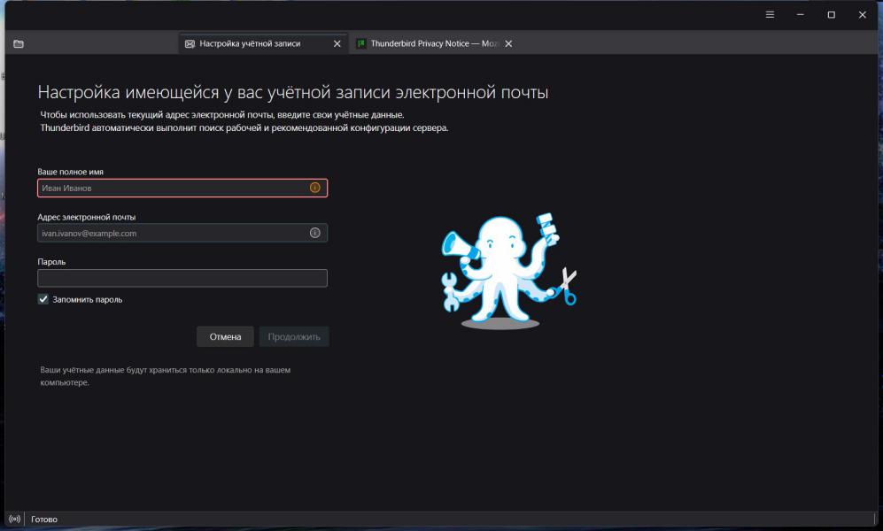 Интеллектуальный мастер настройки учетной записи Раньше пользователю необходимо было знать точные настройки IMAP, SMTP, а также параметры SSL/TLS. Теперь всё, что требуется предоставить — это ваше имя, адрес электронной почты и пароль. Новый мастер настройки учётной записи самостоятельно отправляет запрос в обширную базу данных и автоматически находит все необходимые настройки за вас.