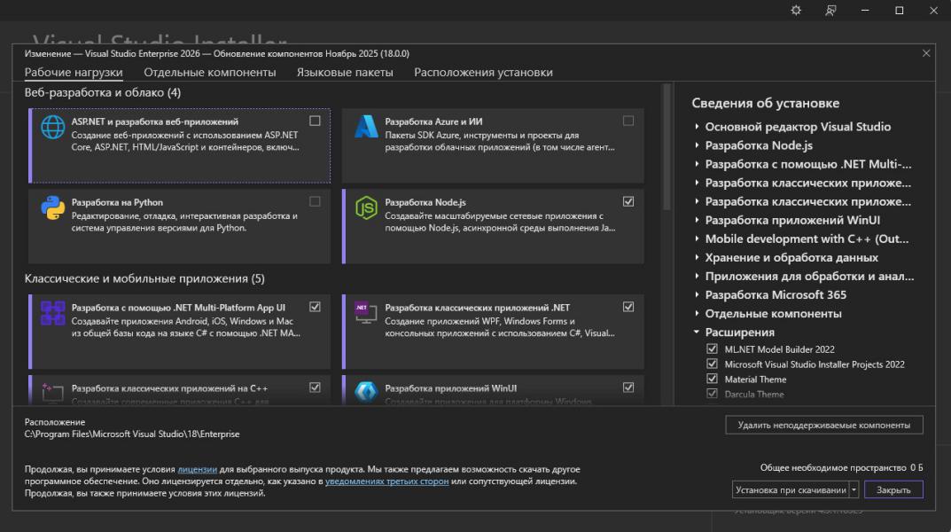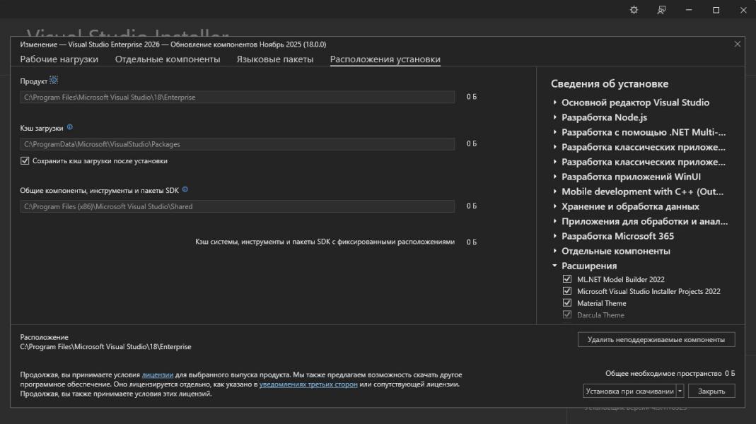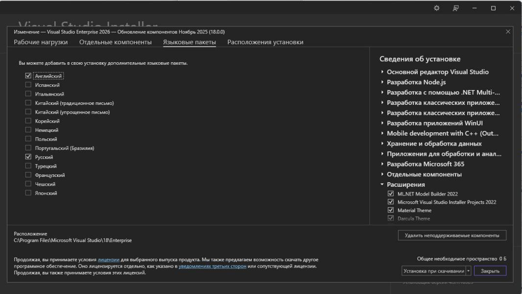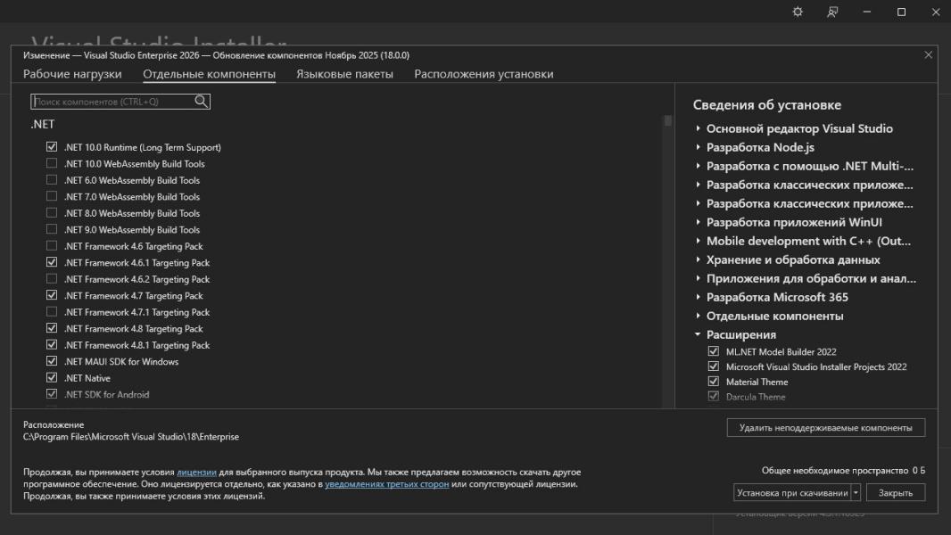 Необходима платформа .NET Framework 4.7.2 или выше; Visual Studio использует .NET Framework 4.8. Если она отсутствует, установка выполнит её автоматическую установку.