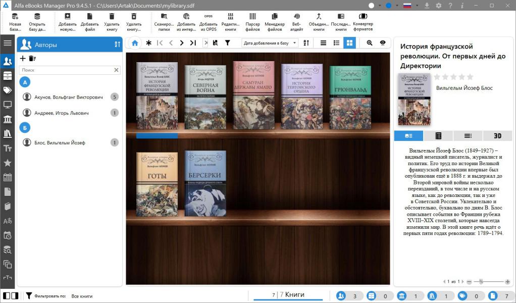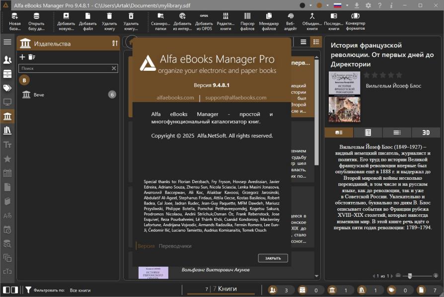 Alfa eBooks Manager — это продвинутая программа для коллекционеров книг, студентов, исследователей и владельцев корпоративных библиотек. Программа позволяет создавать централизованную библиотеку на вашем компьютере, объединяя бумажные и электронные книги. Она упрощает организацию всех имеющихся книг, независимо от формата, и автоматически сканирует компьютер для добавления найденных изданий в базу данных. Пользователь может редактировать карточки книг, добавлять теги, сортировать и конвертировать файлы, открывать книги через встроенный Alfa Reader или любой другой ассоциированный просмотрщик, а также прослушивать аудиокниги.