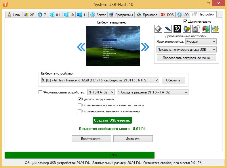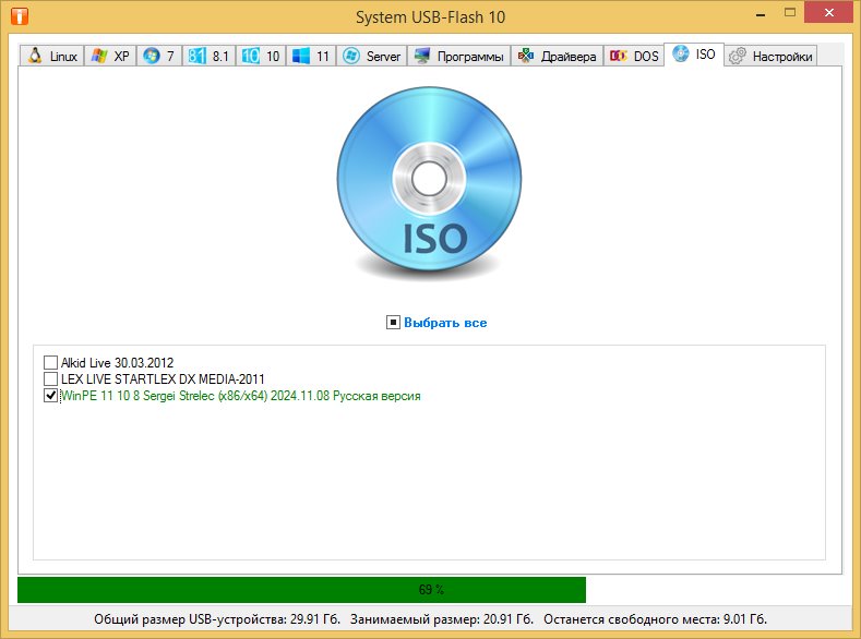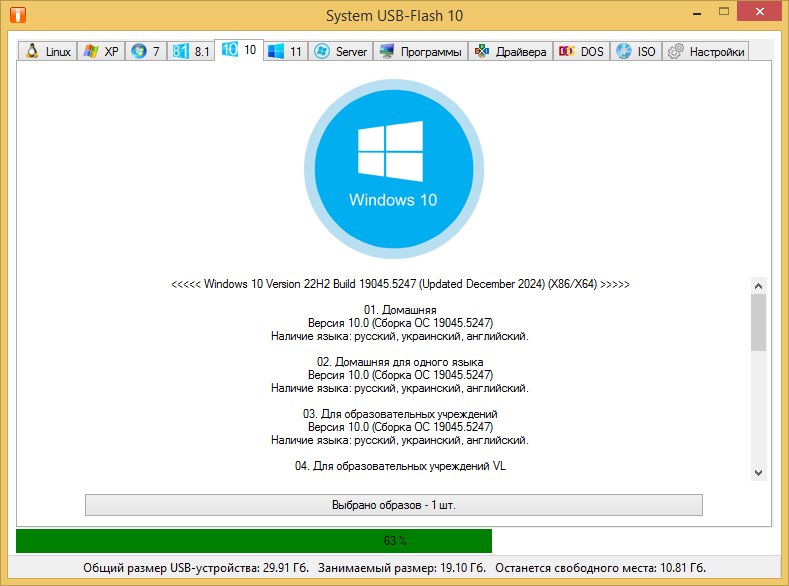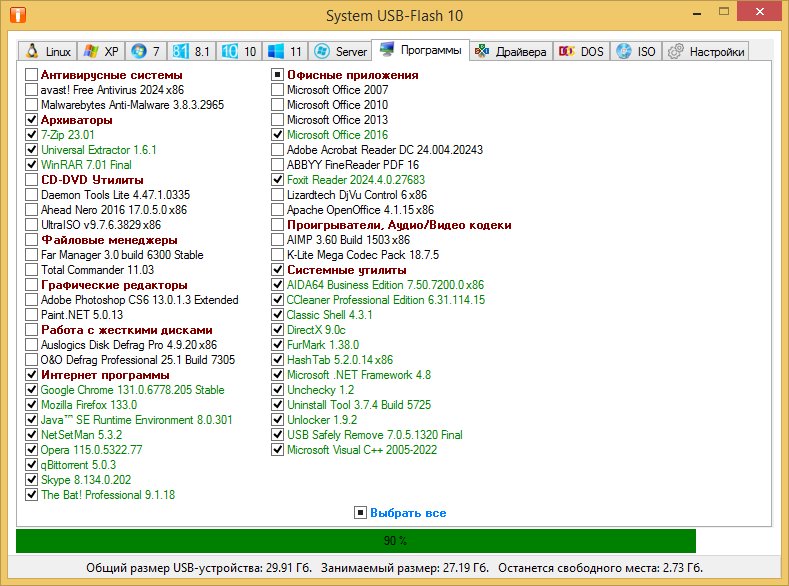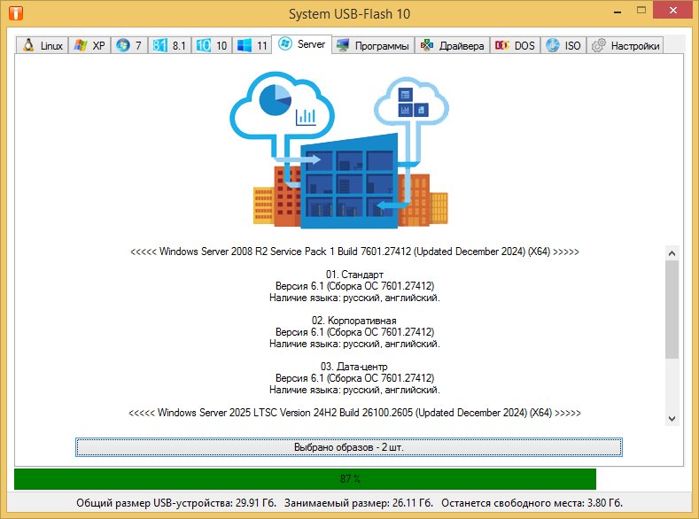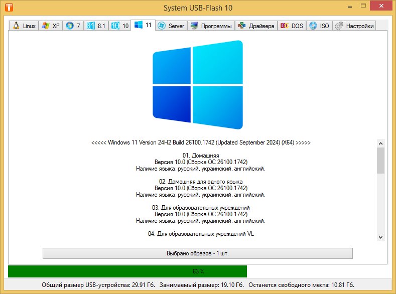 System USB-Flash — это продвинутая утилита-конструктор, предназначенная для создания универсальных загрузочных USB-носителей. Программа разработана специально для пользователей, не имеющих глубоких знаний в области установки систем, и позволяет быстро и просто подготовить флешку любого объёма — от 1 Гб до 64 Гб и выше. Благодаря гибкому интерфейсу и автоматизированным настройкам, утилита одинаково востребована как у домашних пользователей, так и у системных администраторов.