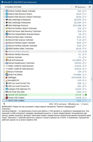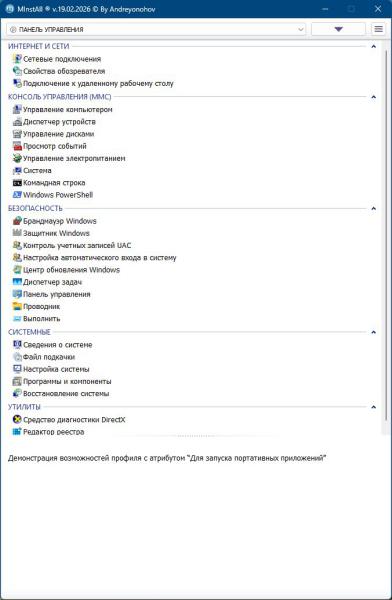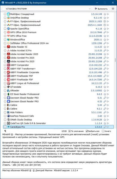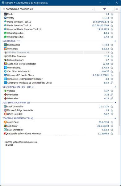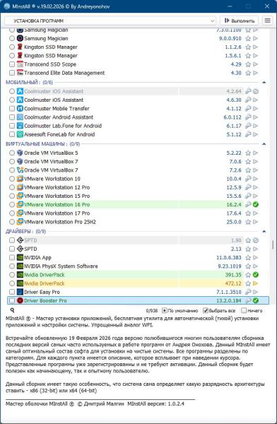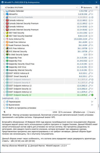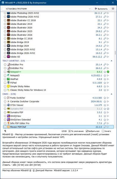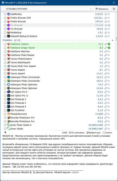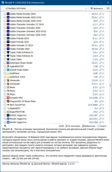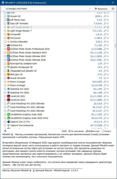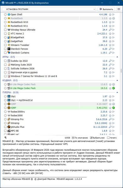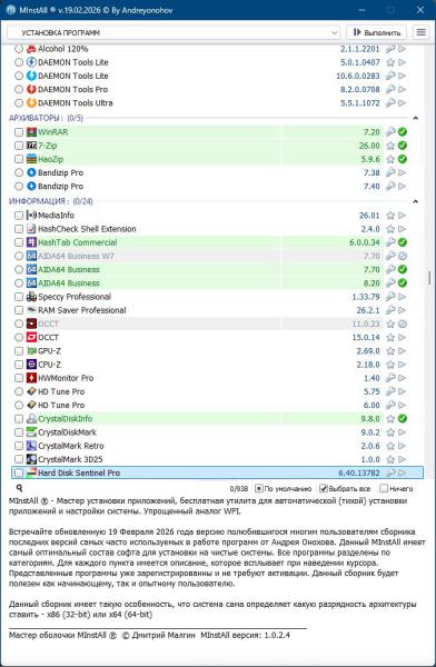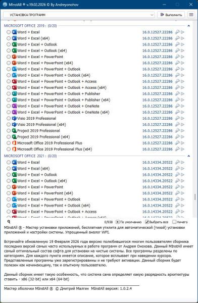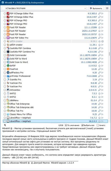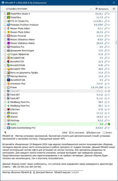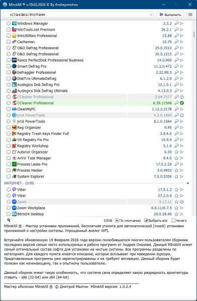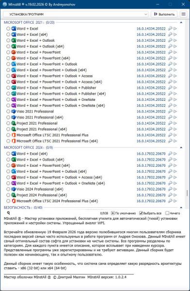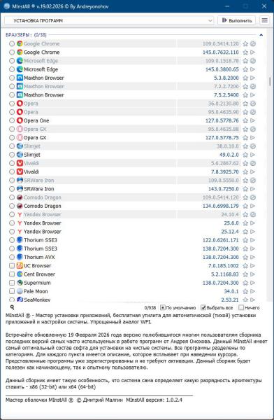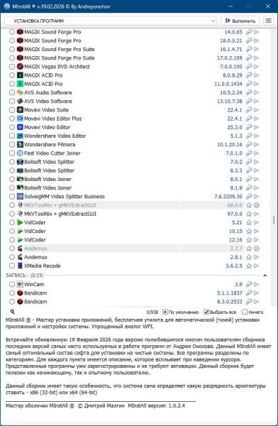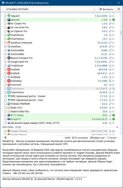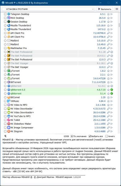 Перед вами обновлённый по состоянию на 19 Февраля 2026 года, полюбившийся тысячам пользователей сборник самых свежих версий наиболее востребованного в повседневной работе и дома софта от автора Андрея Онохова. Проект представлен в новой, ещё более лаконичной и интуитивно понятной оболочке. MInstAll — это инновационный мастер инсталляции приложений, представляющий собой упрощённый и функциональный аналог известного WPI. Данная сборка MInstAll включает в себя идеально сбалансированный набор программного обеспечения, предназначенного для установки на только что установленные операционные системы. Все представленные в сборке программы уже предварительно зарегистрированы и не требуют от пользователя выполнения действий по активации.