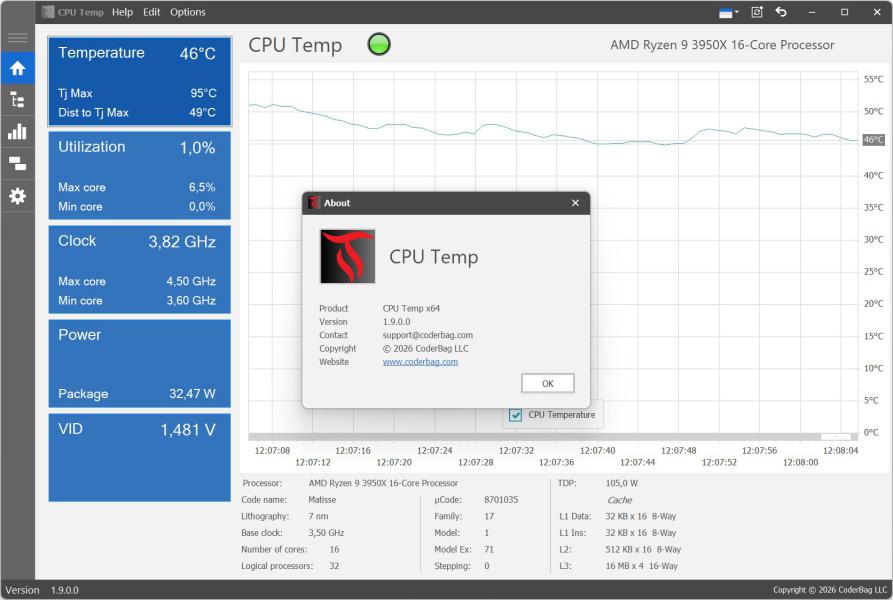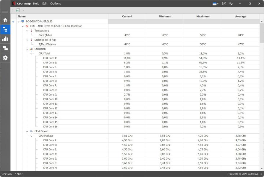 CPU Temp использует понятный и интуитивно воспринимаемый интерфейс, чтобы предоставить максимально простое в использовании, но при этом мощное решение для контроля температуры процессора, а также мониторинга других ключевых показателей CPU. С левой стороны главного окна располагается панель навигации, структурированная в виде отдельных пунктов меню, каждый из которых соответствует определённым функциям и режимам работы приложения.