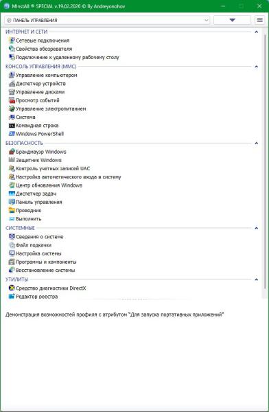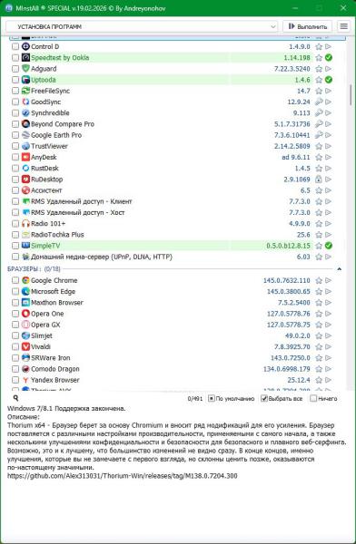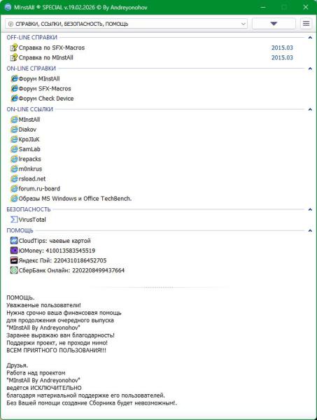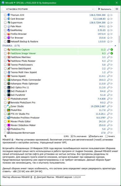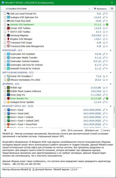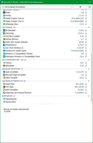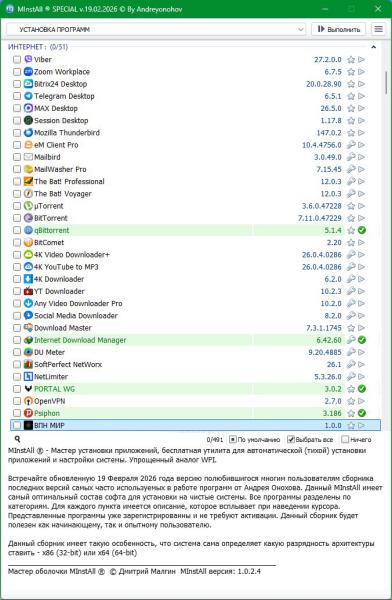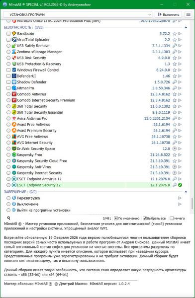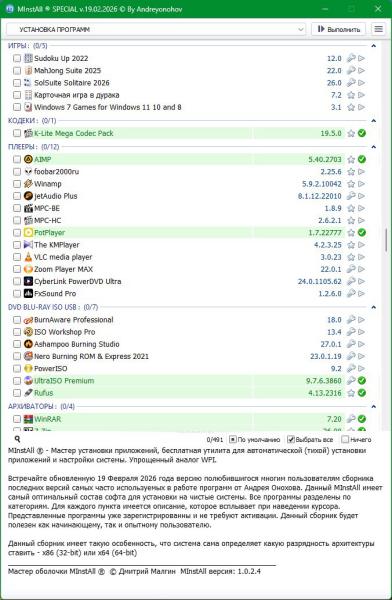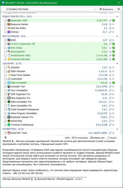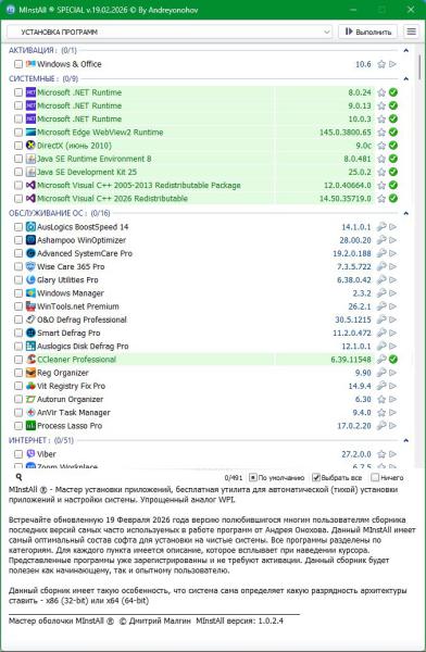 Перед вами обновлённый по состоянию на 19 Февраля 2026 года, полюбившийся тысячам пользователей сборник самых свежих версий наиболее востребованного в повседневной работе и дома софта от автора Андрея Онохова. Проект представлен в новой, ещё более лаконичной и интуитивно понятной оболочке. MInstAll — это инновационный мастер инсталляции приложений, представляющий собой упрощённый и функциональный аналог известного WPI. Данная сборка MInstAll включает в себя идеально сбалансированный набор программного обеспечения, предназначенного для установки на только что установленные операционные системы. Все представленные в сборке программы уже предварительно зарегистрированы и не требуют от пользователя выполнения действий по активации.