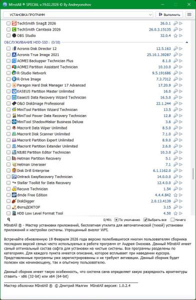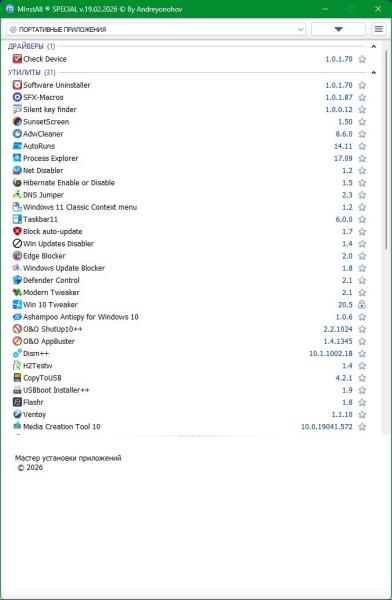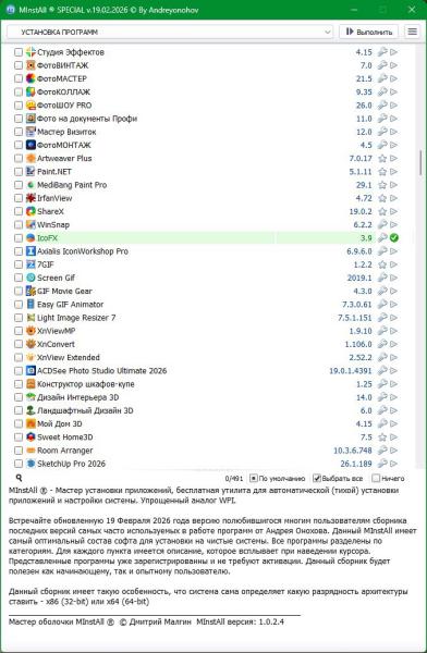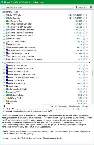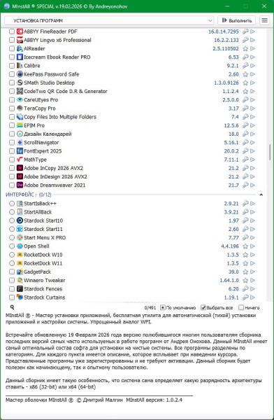 Перед вами обновлённый по состоянию на 19 Февраля 2026 года, уже успевший завоевать признание множества пользователей комплект самых актуальных версий программного обеспечения, наиболее востребованного в профессиональной деятельности и повседневном использовании, подготовленный Андреем Оноховым. Релиз представлен в обновлённой, более лаконичной и интуитивно-понятной программной оболочке. MInstAll представляет собой современный мастер инсталляции приложений, являясь упрощённым, но не менее функциональным аналогом известного установщика WPI.