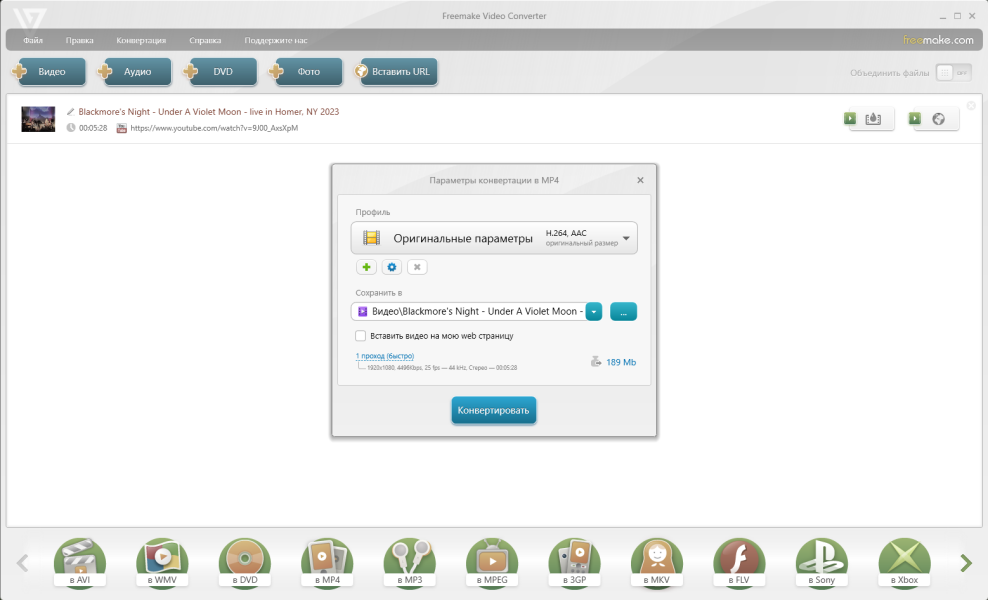 Загрузка роликов с популярных сайтов Программа позволяет скачивать и конвертировать видео с YouTube, Vimeo, VK, Facebook, Dailymotion и других ресурсов. Можно сохранить материал в MP4, AVI, WMV, MKV или DVD, а также извлечь только аудио в формате MP3. Готовые файлы автоматически добавляются в iTunes или переносятся на устройства Apple. Приложение поддерживает загрузку контента в Full HD-качестве.
