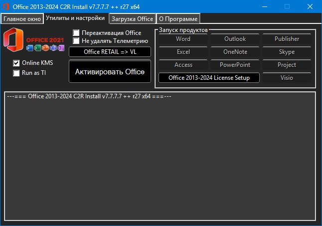 Office 2013-2024 Install используется для online-установки и активации Microsoft Office версий 2013-2024 (C2R). Также доступна функция создания собственного offline-дистрибутива для автономной установки без интернет-доступа.