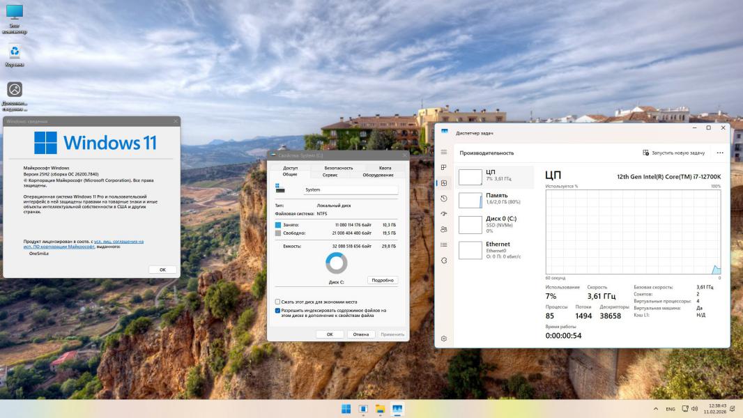 Представленная сборция сформирована строго на основе оригинальных дистрибутивных образов корпорации Microsoft, без применения каких-либо пиратских модификаций или переработанных сторонними лицами установочных пакетов. Инсталляция и предварительная настройка среды выполнялись с помощью лаунчера, разработанного автором под псевдонимом ФБ. Базовым компонентом для создания сборки послужил официальный образ ru-ru_windows_11_business_editions_version_25h2_updated_jan_2026_x64_dvd_d869ebf3. В систему интегрированы все критически важные и рекомендованные обновления безопасности, выпущенные вплоть до 11 февраля 2026 года. Произведено тотальное удаление всех приложений, относящихся к категории Modern UI, включая их фоновые службы, кэши и остаточные записи в реестре. Системный поиск сохранён в полностью работоспособном состоянии, однако графический индикатор поиска на панели задач скрыт для обеспечения эстетики интерфейса. Всевозможные каналы сбора телеметрических данных, включая скрытые диагностические службы и драйверы обратной связи, полностью вырезаны. Взаимодействие с дистрибутивом и внесение изменений в образ производились исключительно штатными средствами DISM. Итоговый образ операционной системы упакован в высокоэффективный формат ESD, обеспечивающий максимальную степень сжатия и ускоренное развёртывание.