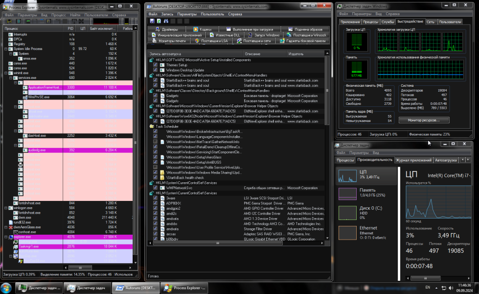 По умолчанию активен диспетчер задач, стилизованный под Windows 7 (оригинальный диспетчер Win10 можно вызвать через контекстное меню рабочего стола).
