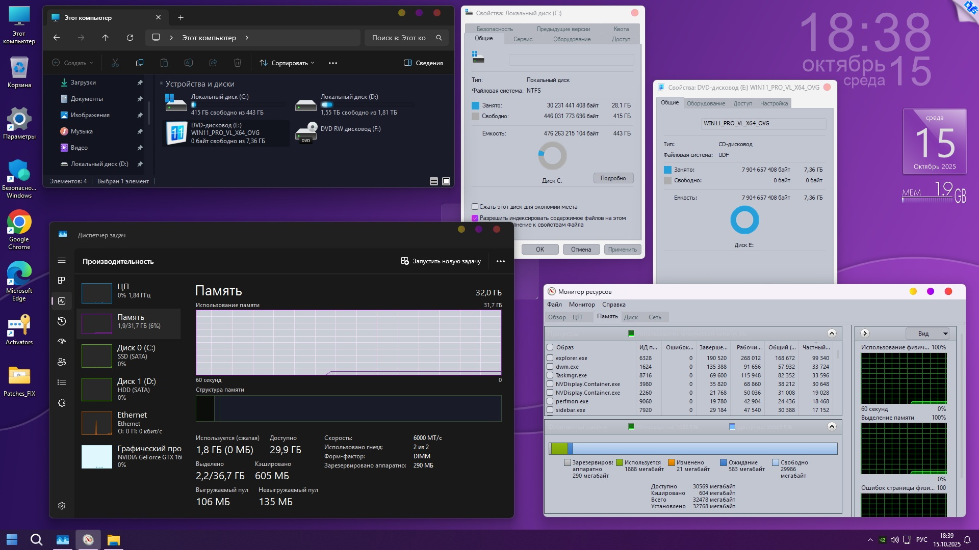 Отключены: Защитник Windows, автоматическое обновление, Контроль учетных записей (UAC), "Новости и Интересы" и SmartScreen (см. замечания п.9).