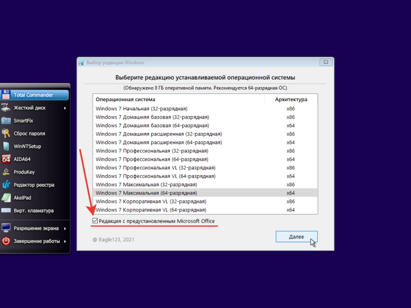 В меню выбора редакций Windows, cделайте двойной клик левой кнопкой мыши в пустом месте вокруг списка редакций.