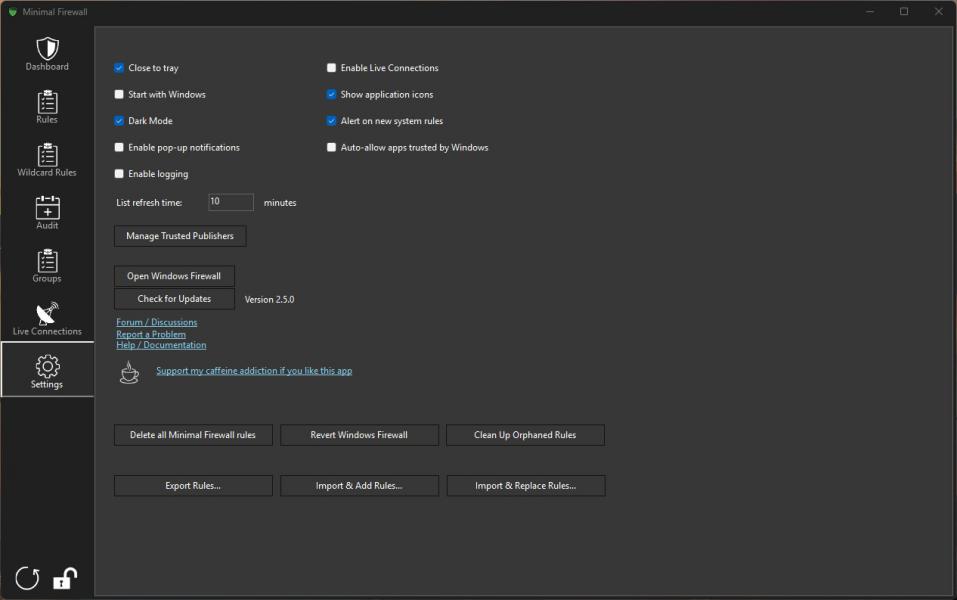 Портативность и простота использования: Minimal Firewall — это единый исполняемый файл, который не требует установки. Все настройки сохраняются в нативном брандмауэре Windows, что исключает необходимость установки дополнительных драйверов, сервисов или библиотек.