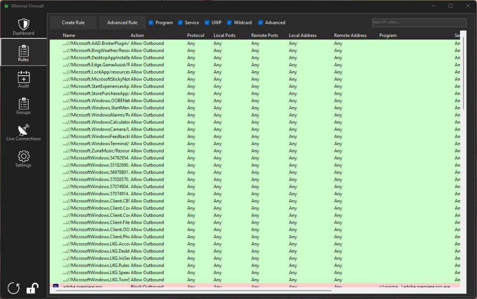 Поддержка приложений UWP и системных служб: Minimal Firewall одинаково хорошо управляет как классическими десктопными программами, так и современными приложениями из Microsoft Store, а также системными фоновыми службами.