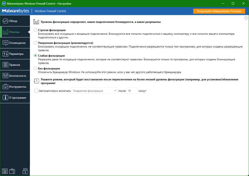 Malwarebytes Windows Firewall Control — это мощная и удобная утилита, расширяющая возможности стандартного брандмауэра Windows. С её помощью пользователь получает мгновенный доступ к ключевым настройкам и функциям защиты сети прямо из системного трея, без необходимости вручную открывать системные панели. Программа позволяет эффективно управлять правилами соединений, контролировать сетевую активность и оперативно принимать решения о доступе приложений в интернет.