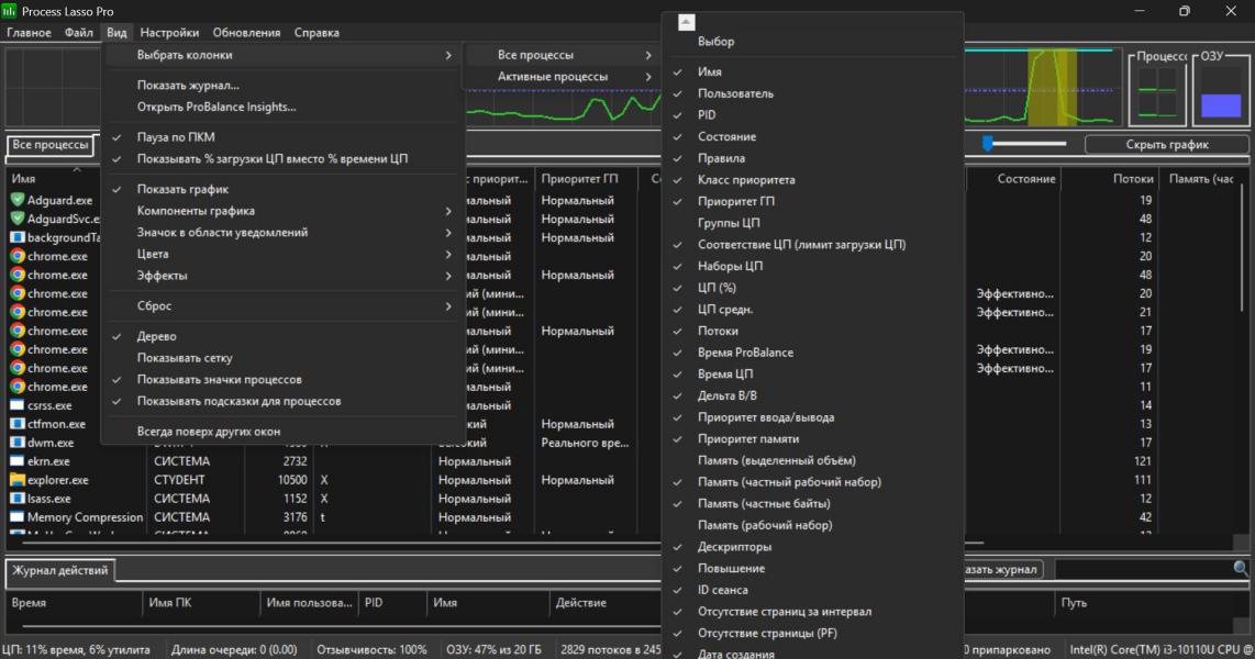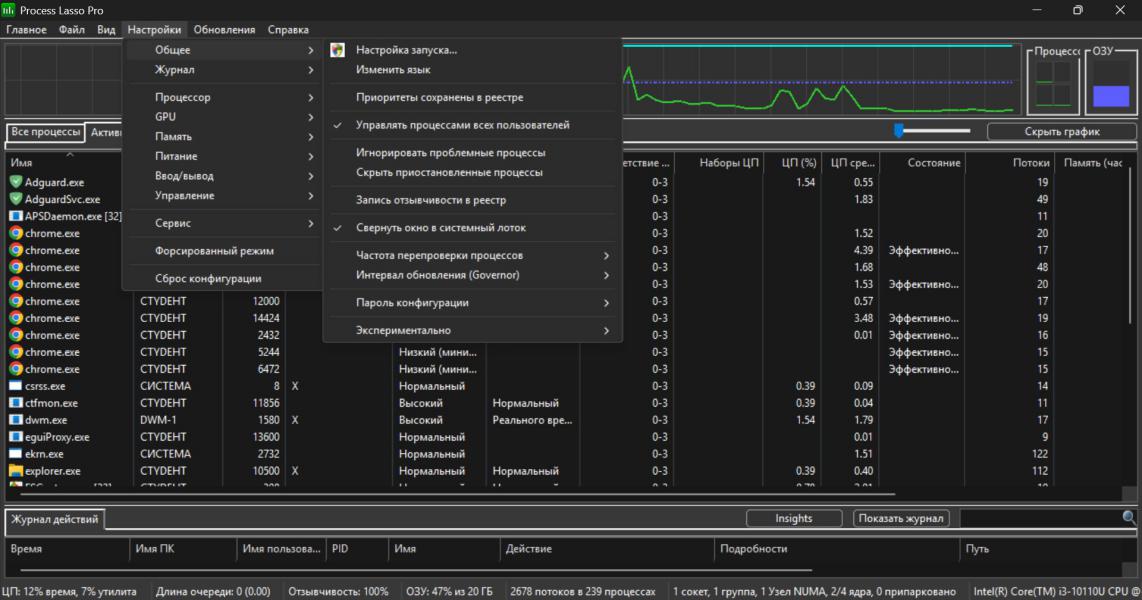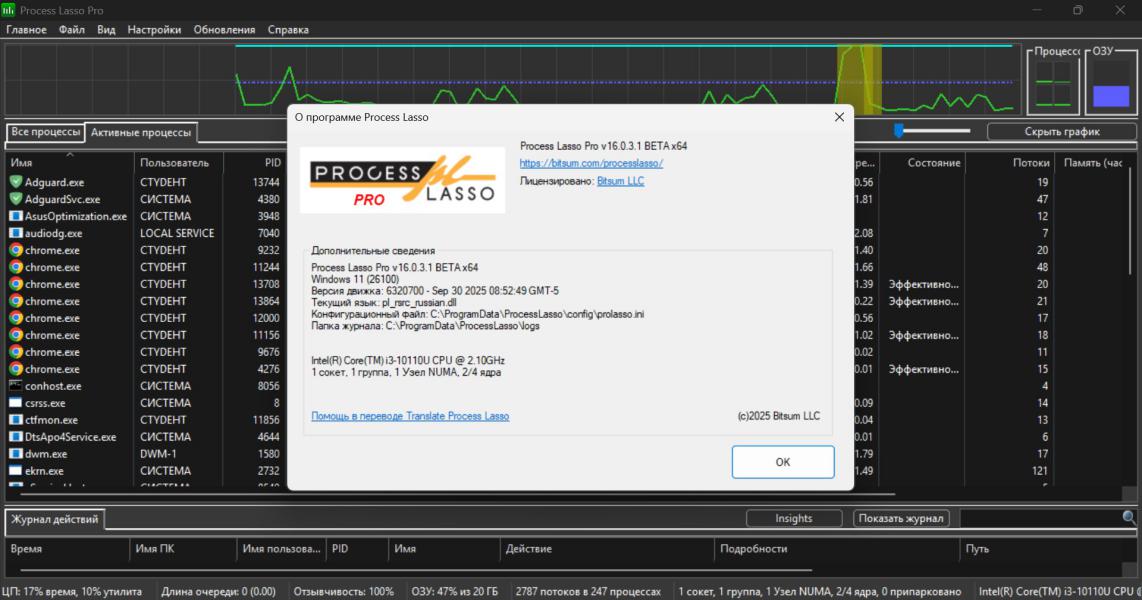 Process Lasso — это инструмент, который позволяет пользователю вручную или автоматически управлять всеми запущенными на компьютере процессами, обеспечивая максимальную скорость работы и стабильность системы. Программа следит за приложениями, активно нагружающими центральный процессор, и при необходимости ограничивает их использование, тем самым повышая отклик системы. Process Lasso также может автоматически снижать приоритет процессов, используя заранее заданные настройки. В стандартной Windows приложения могут полностью занимать ресурсы процессора, что часто вызывает зависания системы и неудобство при работе. Технология ProBalance (Process Balance) аккуратно перераспределяет приоритеты процессов, чтобы те, что раньше перегружали центральный процессор, больше не мешали быстродействию системы.