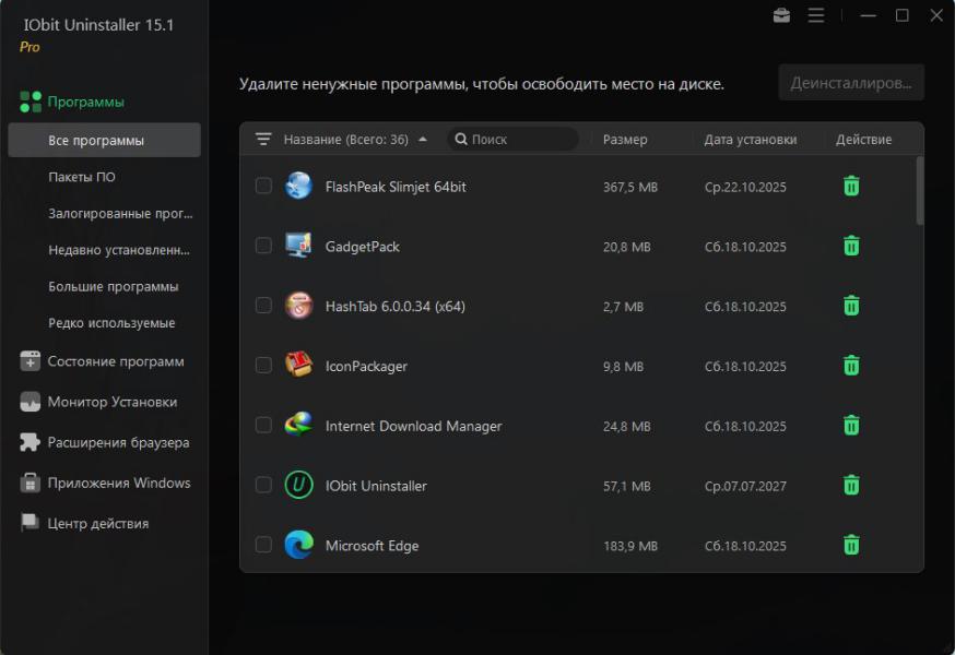 IObit Uninstaller Pro — это мощная и интуитивно понятная утилита, предназначенная для полного удаления нежелательных приложений, панелей инструментов, расширений браузеров и системных компонентов без остаточных следов. Программа обеспечивает высокий уровень очистки благодаря технологиям "Мощное сканирование" и "Принудительное удаление", которые позволяют удалить не только основное приложение, но и скрытые файлы, папки, службы и записи реестра, оставшиеся после стандартной деинсталляции.