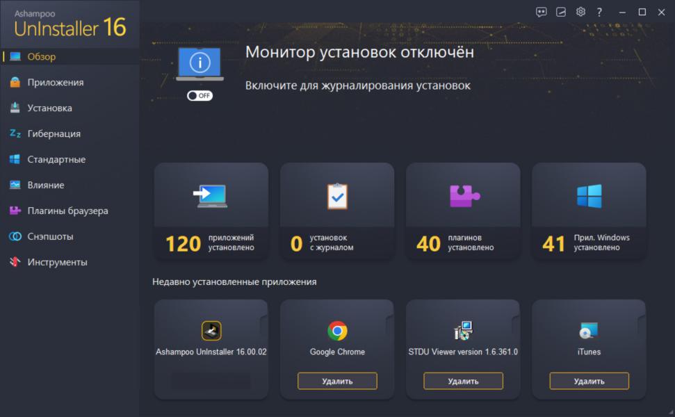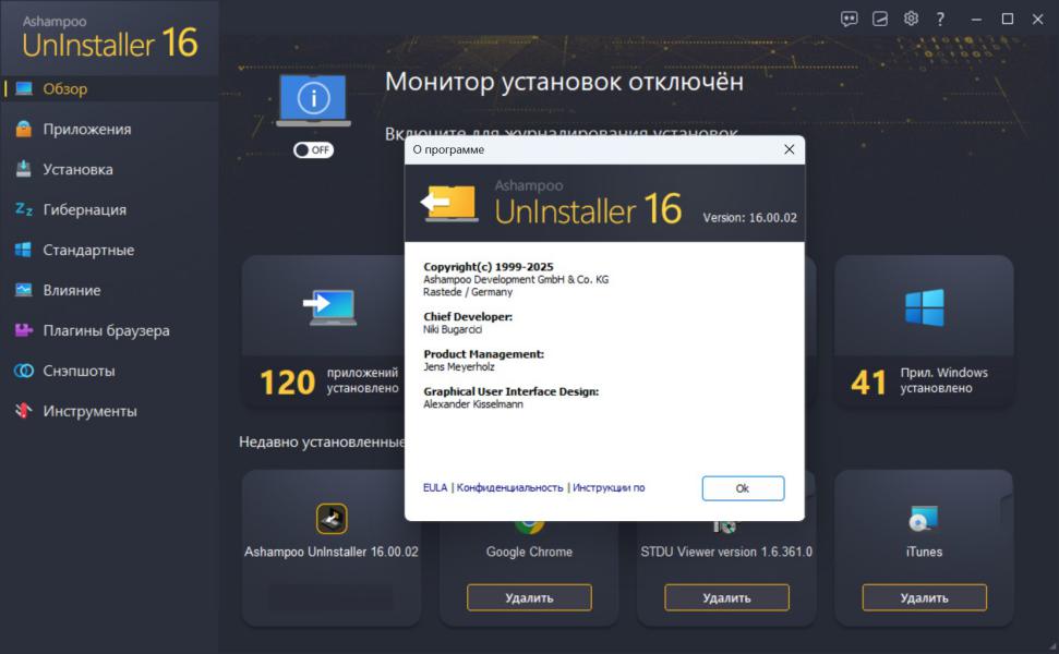 Удаляйте программы полностью — без единого следа!Ashampoo UnInstaller 16 — это универсальное решение для установки, тестирования и безопасного удаления программ. Приложение анализирует и записывает каждый шаг установки, обеспечивая возможность полного отката. Даже если приложение не имело собственного журнала установки, UnInstaller способен с помощью интеллектуального анализа определить все изменения, внесённые программой. Благодаря новым алгоритмам очистки, Registry Optimizer и Crash Analyzer, ваш ПК работает быстрее, стабильнее и чище.