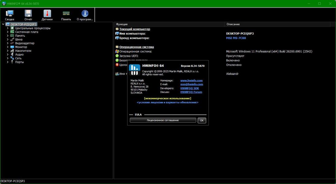 HWiNFO32/64 — это профессиональный диагностический инструмент, предоставляющий детальные сведения о всех аппаратных компонентах вашего компьютера. Утилита анализирует процессор, видеокарту, оперативную память, накопители, материнскую плату, сетевые адаптеры, контроллеры, а также показания встроенных датчиков в режиме реального времени. Программа доступна в двух вариантах — установочном и портативном, что делает её удобной для любого типа пользователей и сценариев применения.