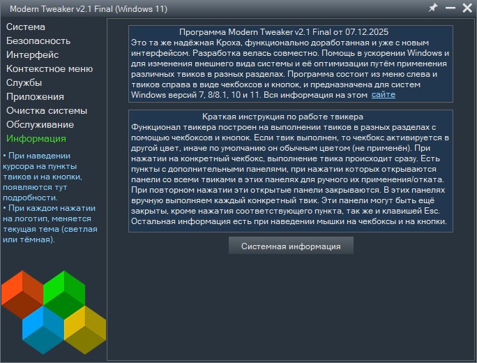 30-11-2025, 11:52, СистемныеWindows Manager — это мощный многофункциональный инструмент для операционных систем Microsoft Windows 10 и Windows 11, который объединяет свыше сорока специализированных модулей для обслуживания, тонкой настройки, очистки и оптимизации. Программа помогает повысить общую скорость работы системы, устранить внутренние ошибки, увеличить стабильность, улучшить безопасность и гибко персонализировать интерфейс под собственные нужды, раскрывая весь потенциал вашей Windows.