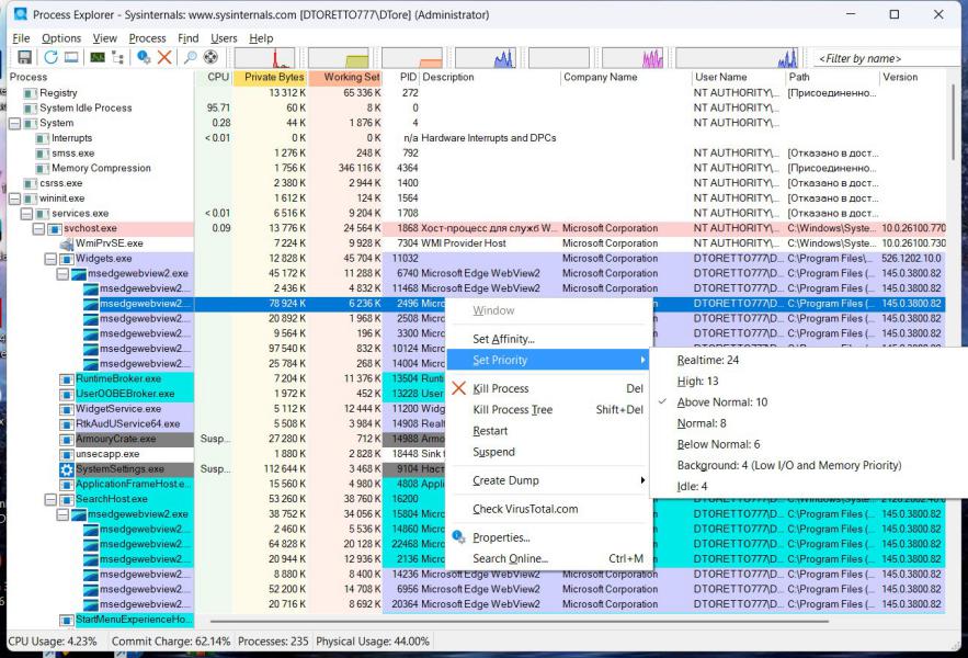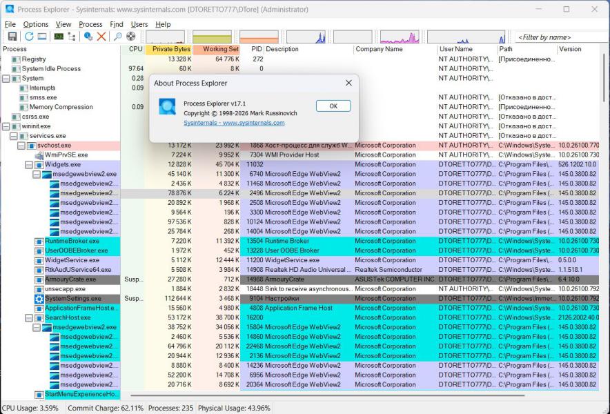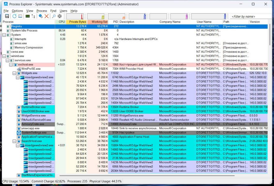 Process Explorer представляет собой расширенную утилиту для всестороннего управления запущенными в системе процессами, которая по своим функциональным параметрам значительно превосходит стандартный Диспетчер задач Windows. Программа отображает в своём окне исчерпывающую информацию о каждом процессе, включая полный путь к исполняемому файлу, сведения об инициаторе автозапуска, результаты проверки на VirusTotal, детальную статистику использования оперативной памяти, центрального процессора, диска и сети, учётную запись пользователя, от имени которой запущен процесс, атрибуты безопасности и множество других параметров.